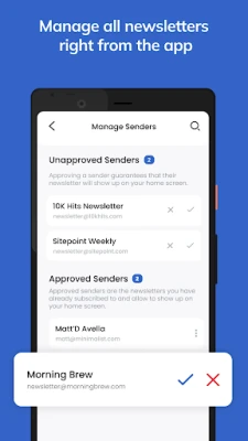 Unsubscribe from unwanted newsletters in just a couple of taps, and sign up for new ones with your Gmail address and manage new senders right from the app.