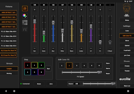 Light Captain can inherently control four color segments on each fixture, each with up to 8 basic colors. No matter if KLS system, LED bar with 4 segments, or wash light with four rings, everything can be easily created and adjusted. For color effects, there is a separate effect section with 6 pre-programmed effects, which can also be modified in the expansion stages.