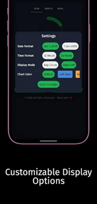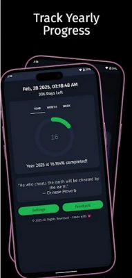 Features Include: > Real-Time Progress Tracking: Instantly see your progress through the year with beautifully designed charts. > Customizable Display Options: Choose between viewing days passed or days remaining—tailor your experience to what motivates you most. > Minimalist and Modern Design: Enjoy a clean interface that keeps you focused on your progress without distractions. > Easy to Use: Simple navigation and clear visuals make time tracking effortless, empowering you to manage your goals and daily tasks.