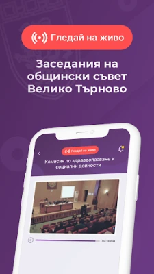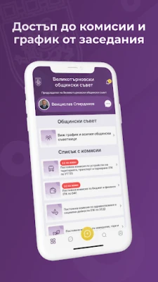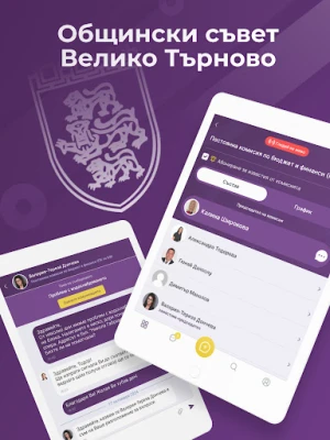 Официалното приложение на Общинския съвет на община Велико Търново позволява на потребителите лесно и бързо да изпращат съобщения до общинските съветници от различните комисии. Могат да се подават сигнали, казуси или различни запитвания чрез съобщения и изпращане на снимки.